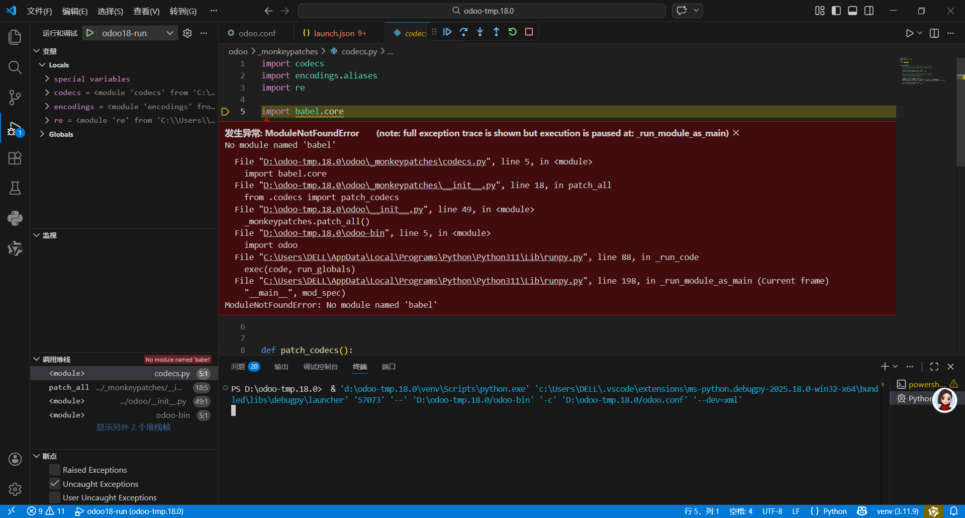 Odoo 根目录下通常有一个 requirements.txt 文件,可以批量安装所有依赖:pip install -r requirements.txt 这个文件你看看,之前是否没有运行过。如果运行过,odoo原生代码基本都能跑了。